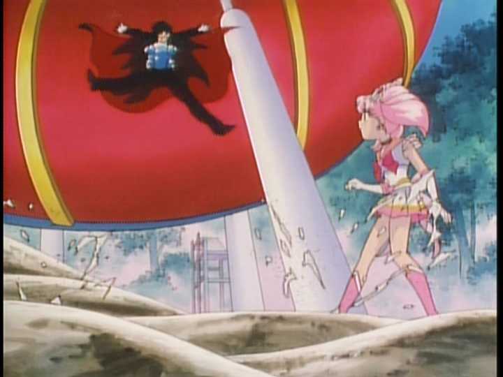 (15 seconds) After Tuxedo Mask bats the BonBon Baby away from Chibi-Moon, we see him stagger to get up, then he gets hit HARD by another BonBon Baby and SLAMS into the ship.